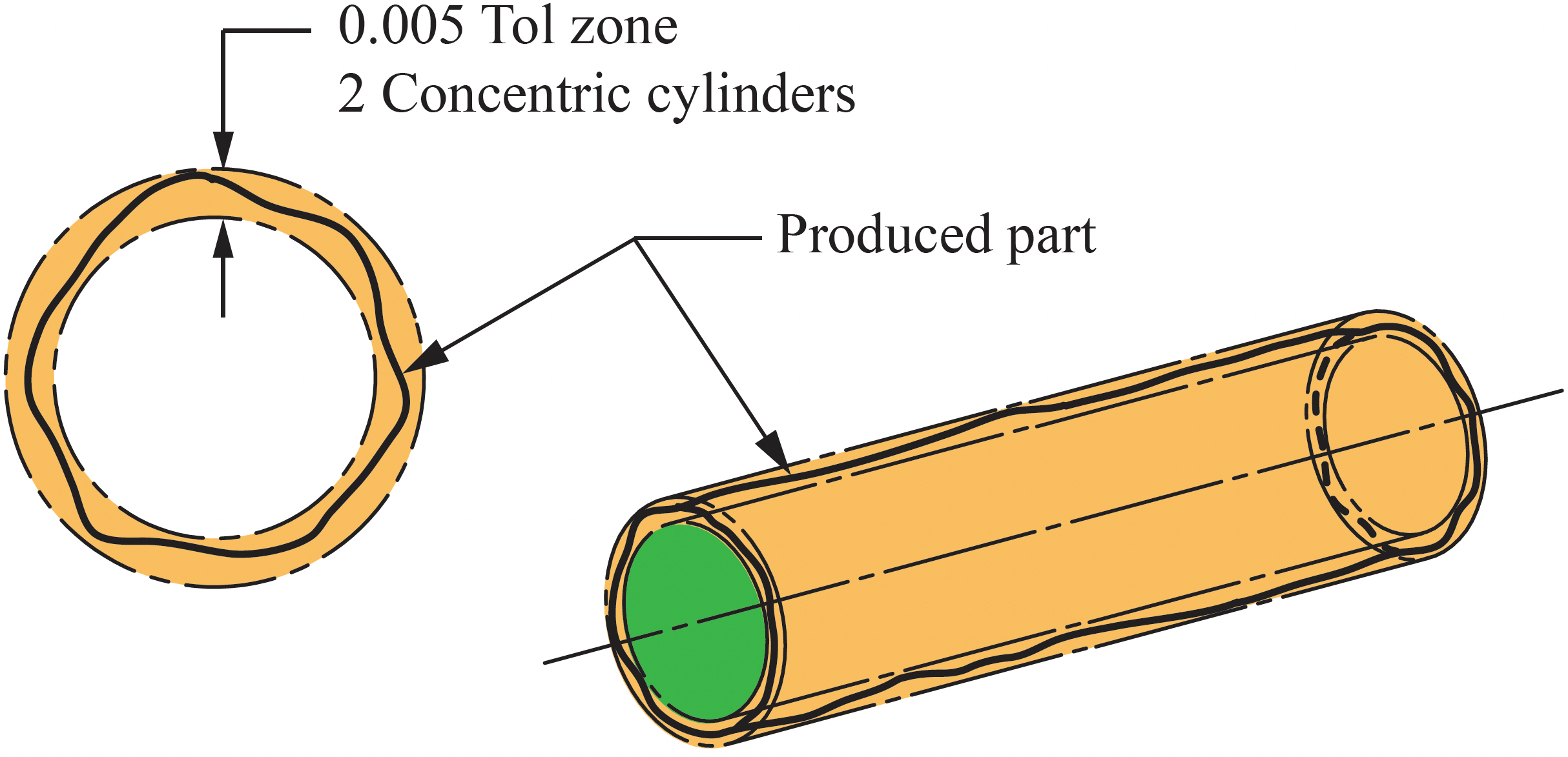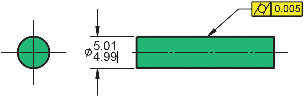 Cylindricity is a 3D tolerance. It controls both the circular and longitudinal elements of the feature. It includes circularity, straightness, and taper of the surface. The cylindrical surface of the feature must lie between two concentric cylinders, one having a radius of 0.005 larger than the other.